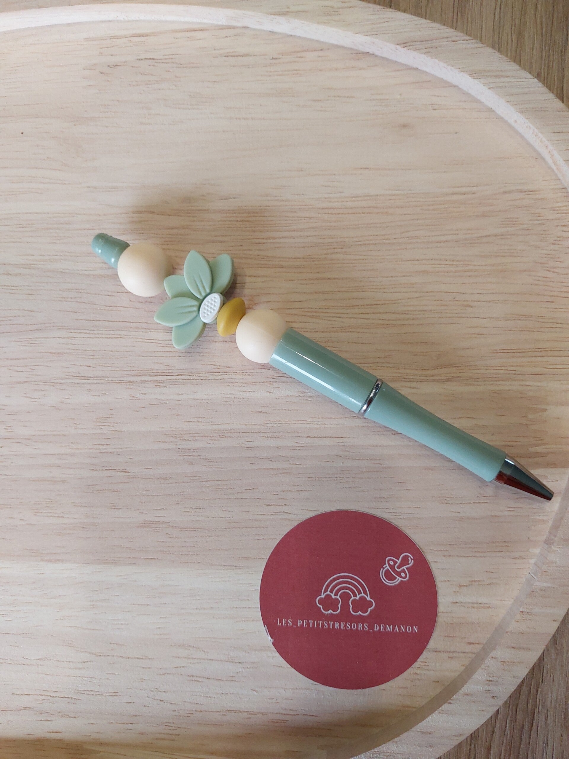 Stylo vert pastel avec une perle en fleur assortie
